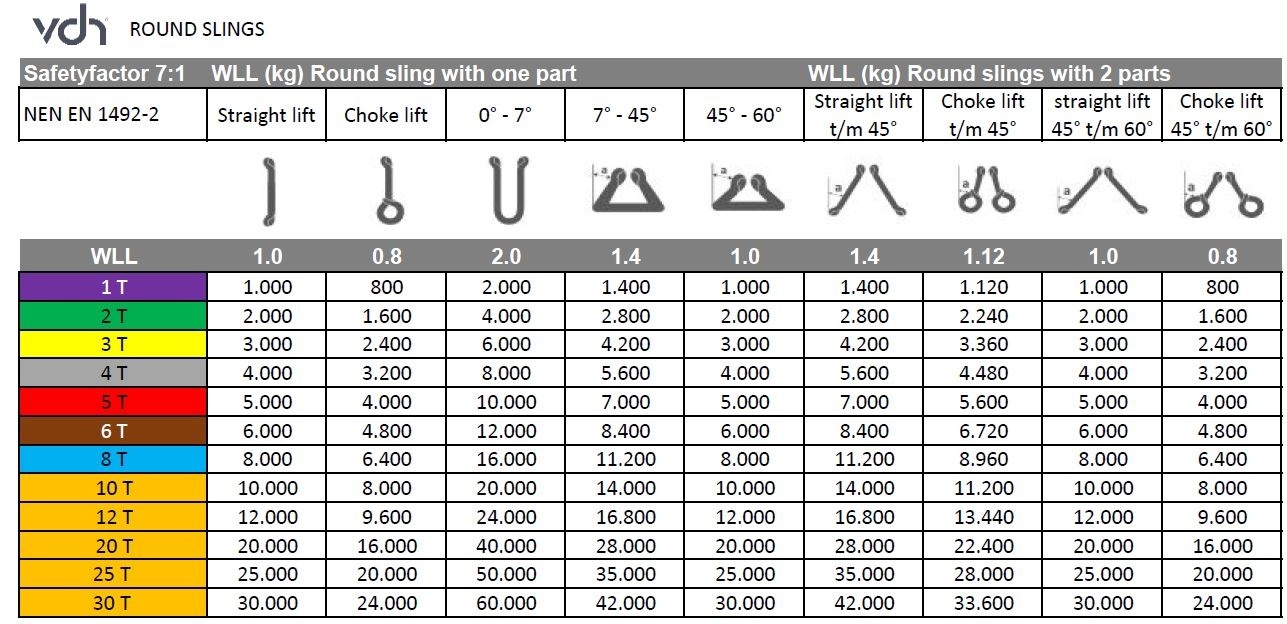 - Belastingsindicatie: Bandkleur, streepcodering en label geven veilige belasting (SWL) aan