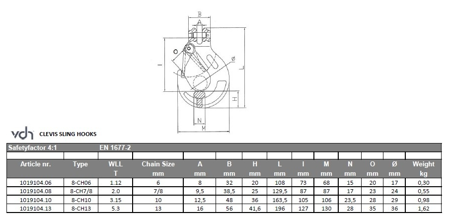 De VDH klephaak, type CH, is voorzien van een robuuste gesmede klep en een gaffel die rechtstreeks op de bijbehorende ketting kan worden gemonteerd. De veiligheidsklep wordt beschermd door een slijtvlak op de haak. De VDH klephaken zijn vervaardigd uit grade 80 staal en voldoen aan de EN 1677-2 norm.