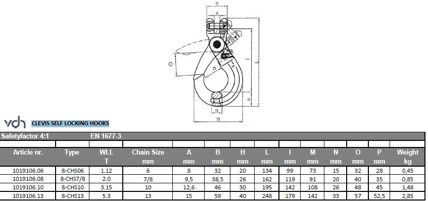 De VDH veiligheidshaken zijn vervaardigd uit grade 80 staal en voldoen aan de EN 1677-3 norm.