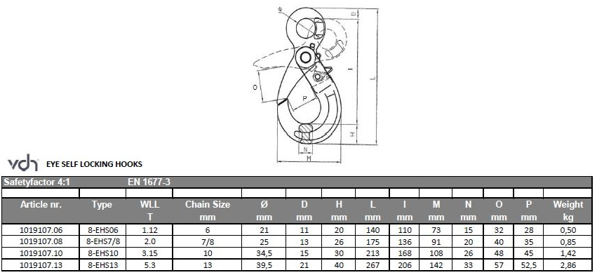 De VDH veiligheidshaken met oog zijn vervaardigd uit grade 80 staal en voldoen aan de EN 1677-3 norm.