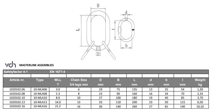 Topschalmen worden gebruikt als het bovenste component van een kettingsamenstelling en dienen om de complete samenstelling veilig in de kraanhaak aan te slaan. De 10-MLA topschalm wordt voornamelijk toegepast bij kettingconfiguraties met drie- of viersprongen. In het schema is overzichtelijk aangegeven welke topschalm geschikt is voor welke kettingdikte en configuratie.