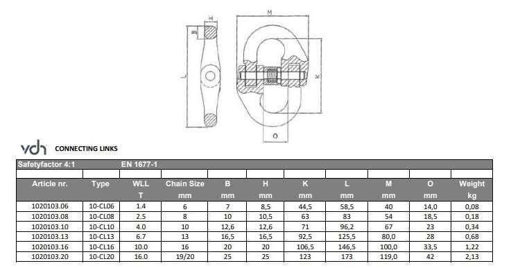 De VDH-verbindingsschalm is ontworpen voor het veilig koppelen van kettingen en ooghaken binnen een kettingsamenstel. De verbindingsschalmen zijn vervaardigd uit grade 100 staal en voldoen aan de norm EN 1677-1, waardoor een hoge betrouwbaarheid en veiligheid gegarandeerd zijn.